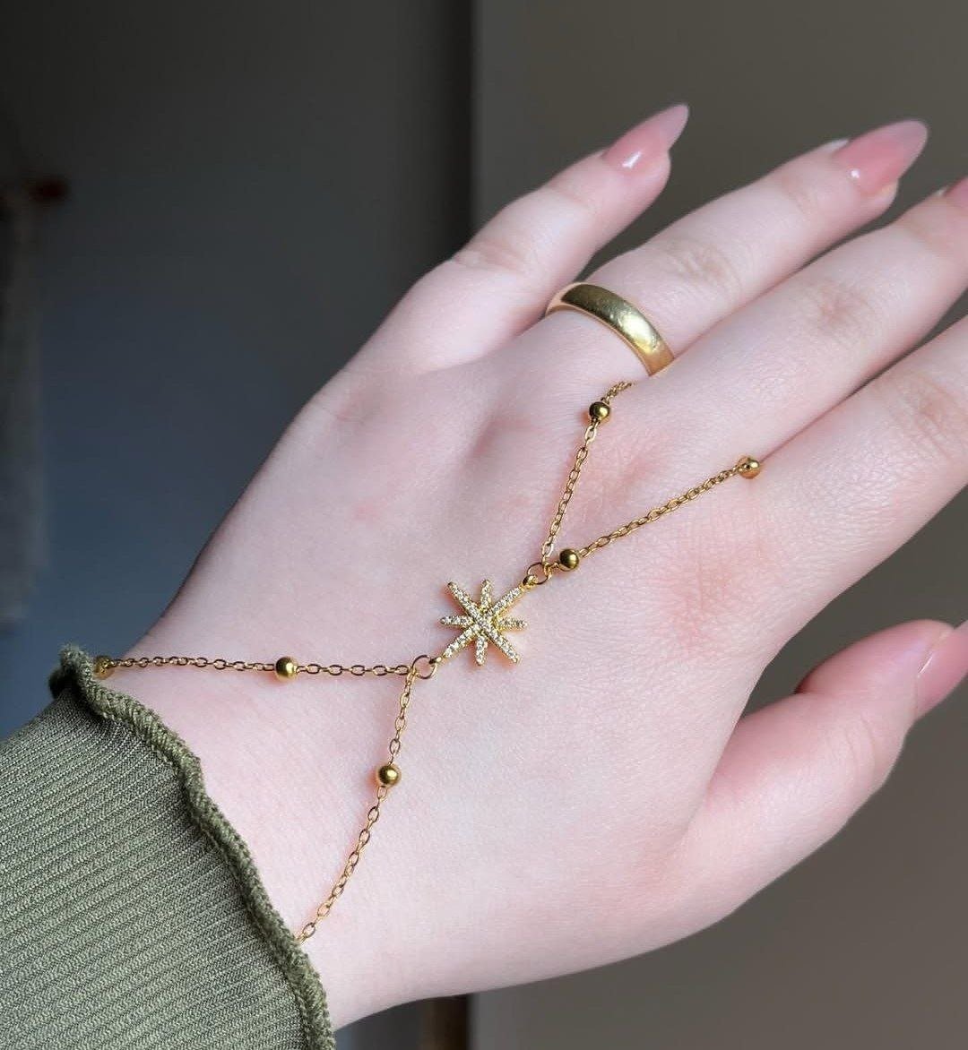 The Polaris hand chain is a unique and stylish accessory designed to add elegance and charm to your hands. Inspired by the Polaris star, this hand chain features delicate star-shaped details and an intricate chain design, making it perfect for casual wear, parties, or special occasions.