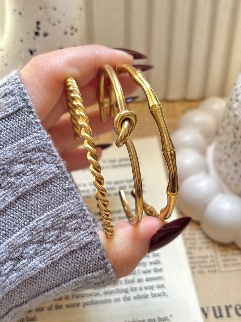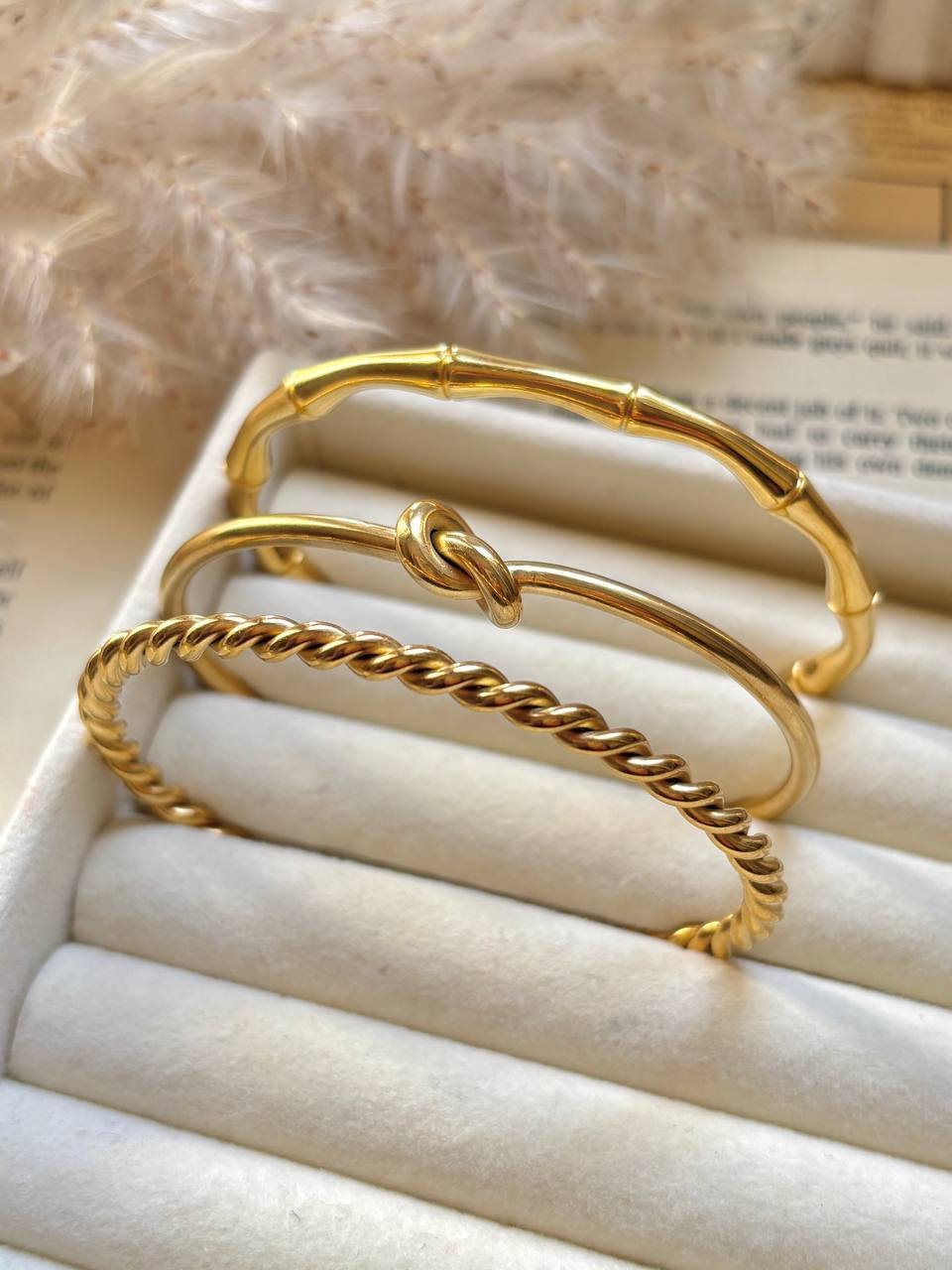 The set of 3 bracelets bamboo knot braid is a trendy and elegant jewelry collection designed for women who love variety and stylish stacking. This set includes three unique designs: bamboo, knot, and braid, each adding its own character and charm to your look.